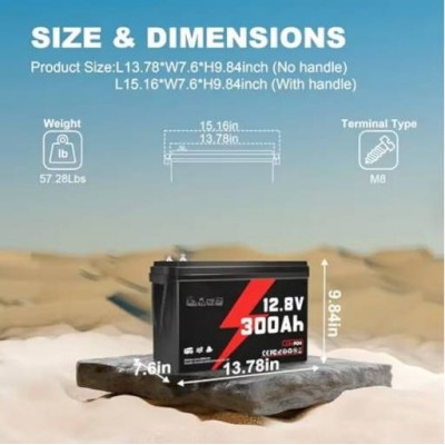 • 3.84 kWh de energía utilizable, rendimiento de mayor duración: 12.Batería LiFePO4 de 8V 300Ah con energía utilizable completa de hasta 3.84 kWh, puede satisfacer las necesidades de equipos para un funcionamiento prolongado, por ejemplo, para el suministro de energía continua de 200 W a una almohadilla térmica durante 19 horas; en invierno, no es necesario recargarla con frecuencia.La batería de litio de 300Ah tiene una baja tasa de autodescarga, la profundidad de descarga puede alcanzar el 100%, en comparación con las baterías de plomo-ácido de 40Ah, la potencia disponible aumentó en un 300%.